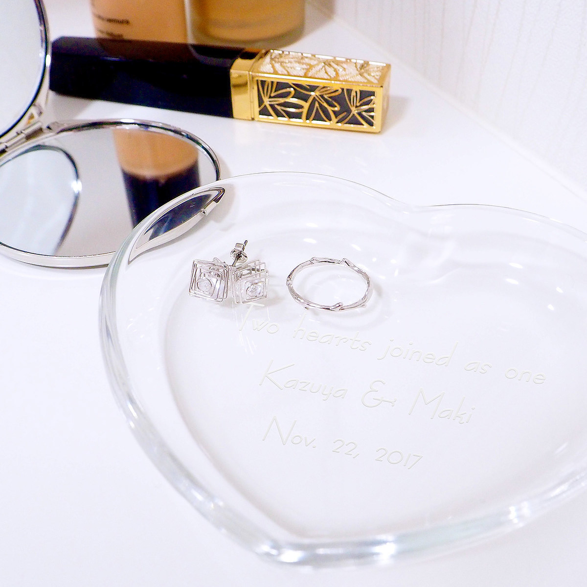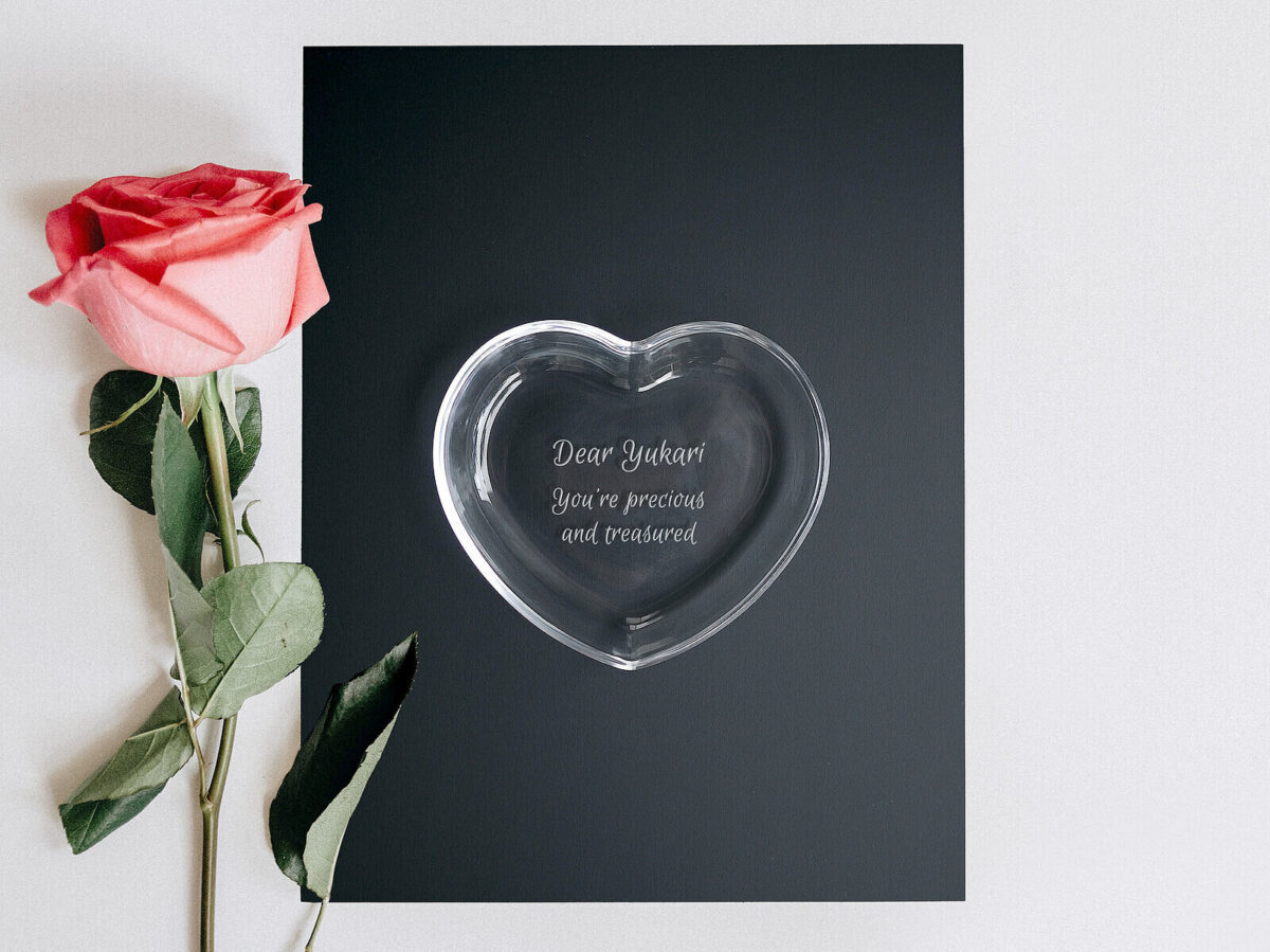 晶瑩剔透的玻璃心形設計,光是放在那裏就閃閃發亮、賞心悅目;更貼心的是,底部還可以若隱若現地刻上文字姓名。
